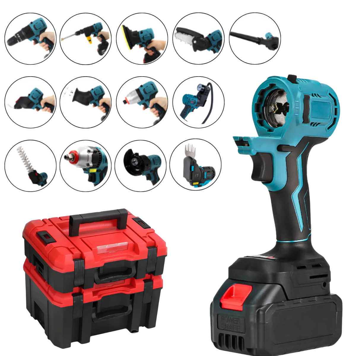 Kit Ferramenta Elétrica Multifuncional 13 em 1 com Bateria 48V 6.0Ah, 2 baterias inclusas, carregador e maleta profissional. Versatilidade total para jardim, corte, perfuração, fixação e limpeza.
